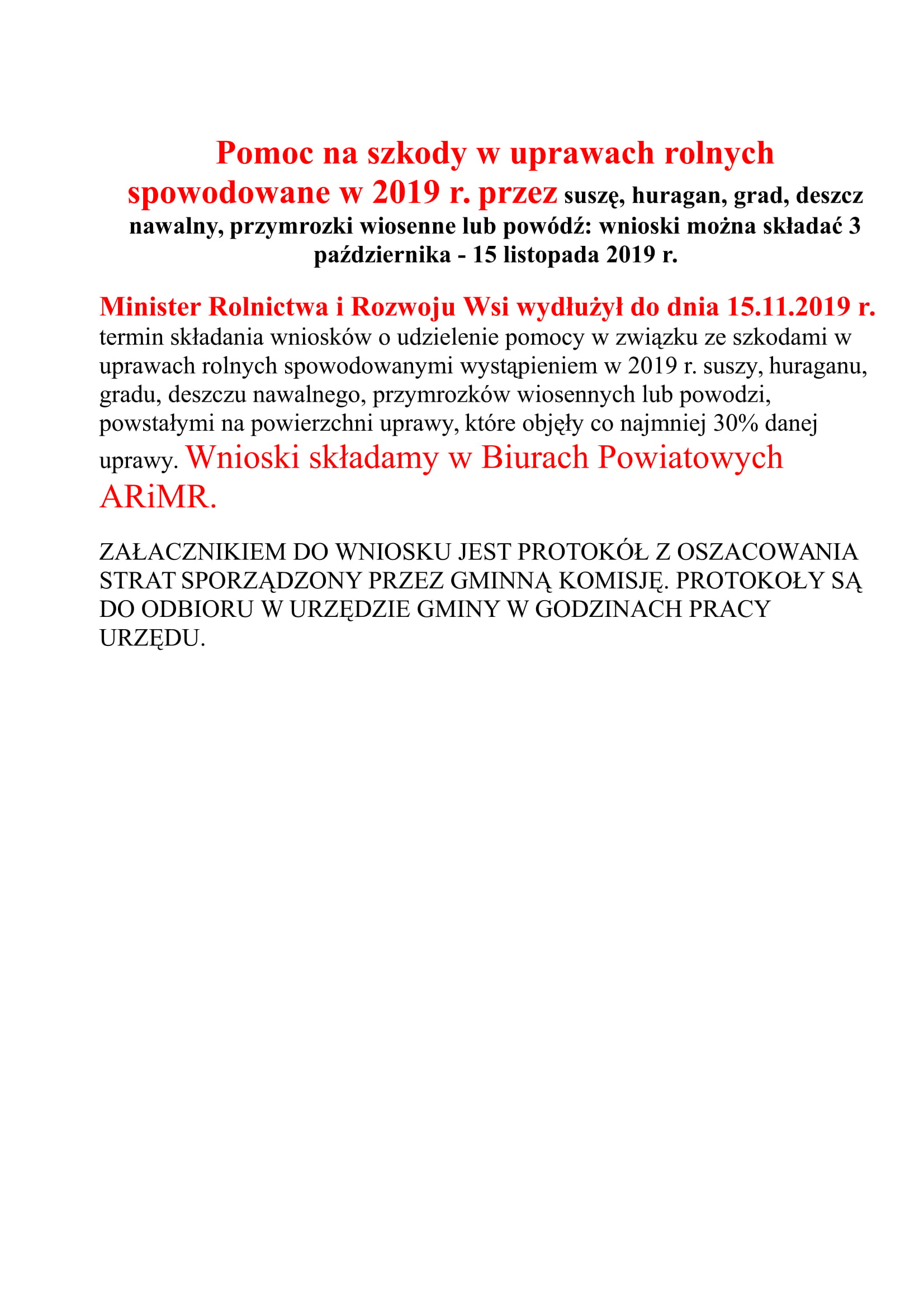 05.11.2019 Pomoc na szkody w uprawach rolnych spowodowane w 2019 r. ,,
