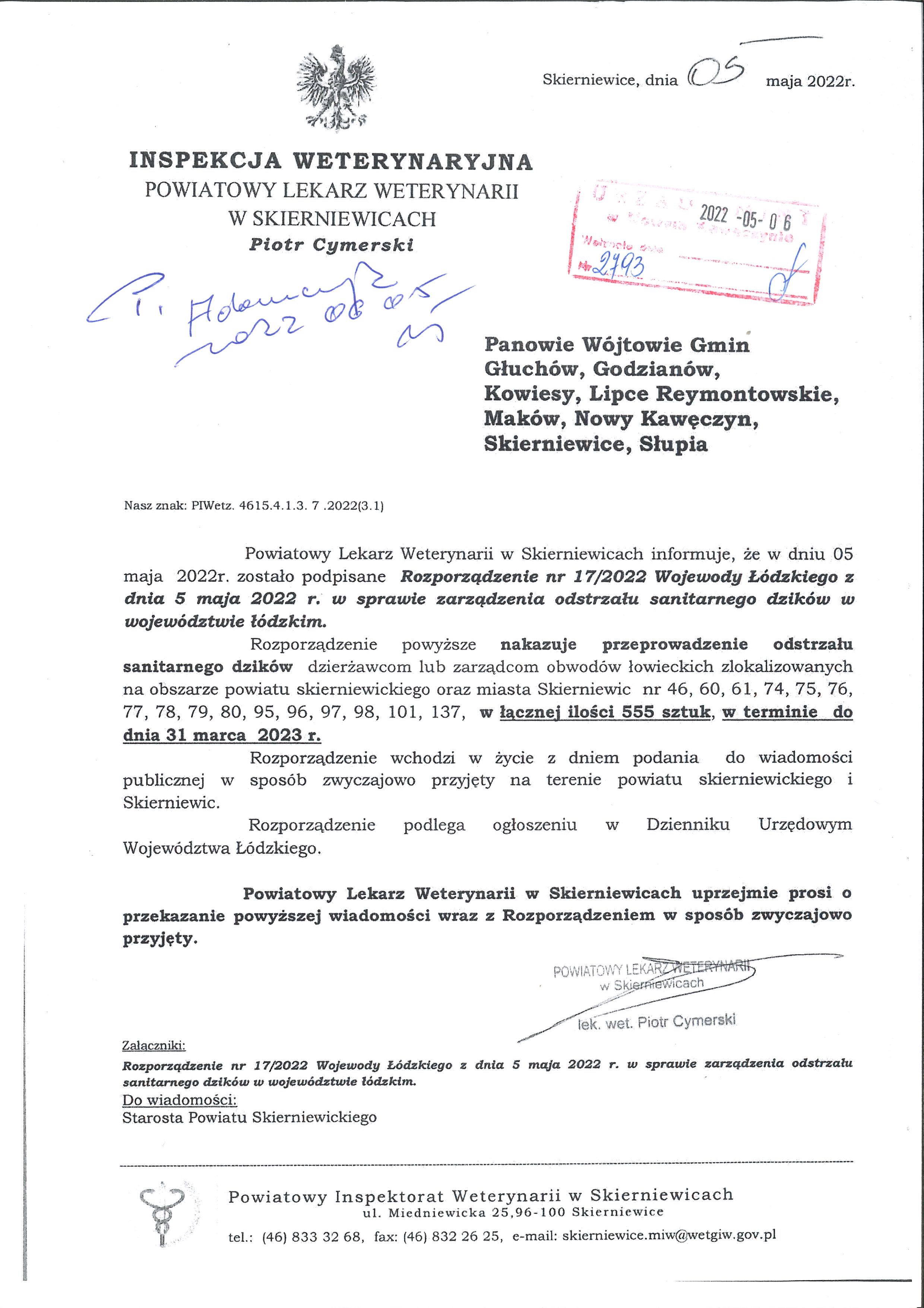 Informacja Powiatowego Lekarza Weterynarii w Skierniewicach o podpisaniu Rozporządzenia nr 17/2022 Wojewody Łódzkiego w sprawie zarządzenia odstrzału sanitarnego dzików w województwie łódzkim. |